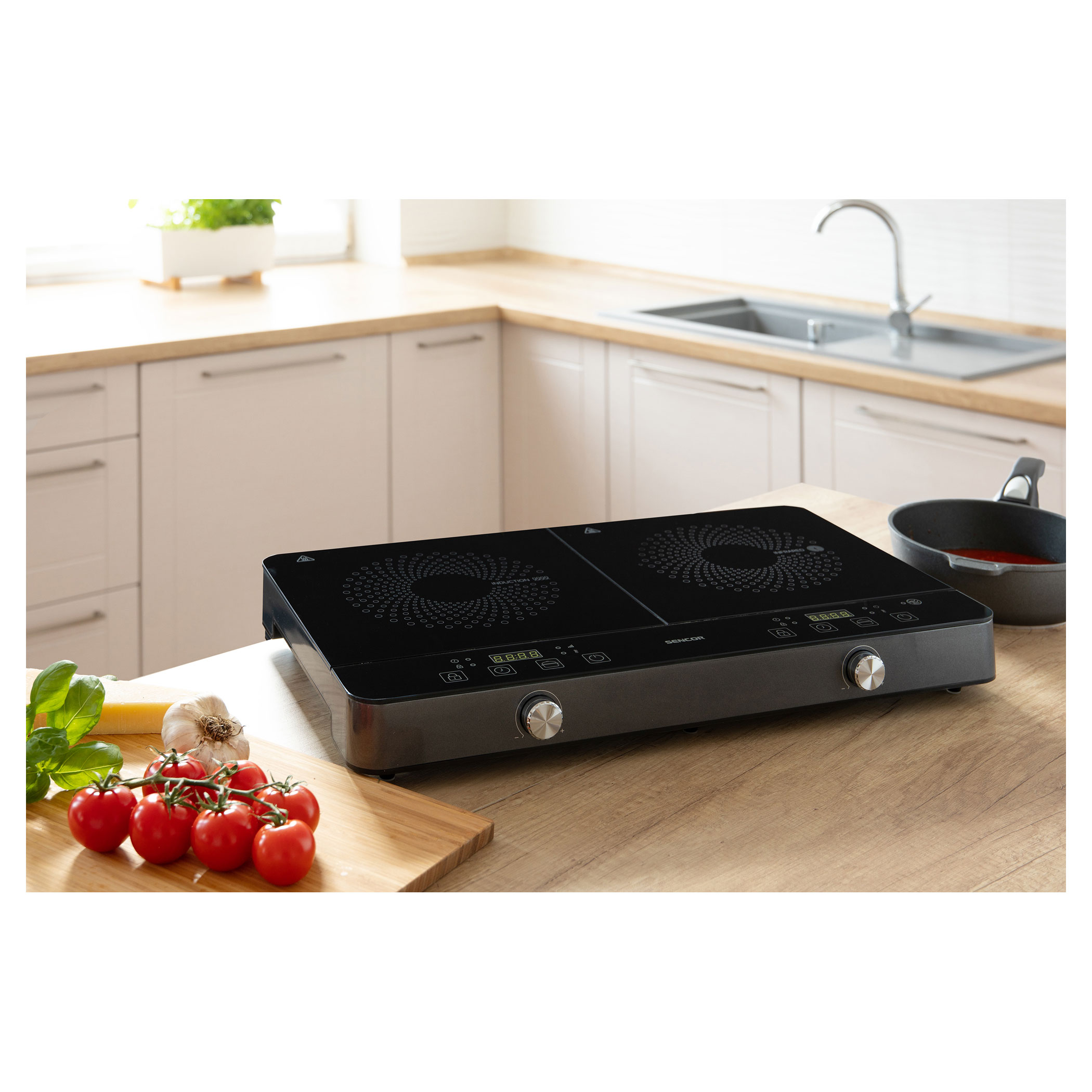 يوفر لوح التسخين بالتحريض الأيسر جميع مزايا الطهي بالتحريض. يمكن ضبط الطاقة بعشر زيادات تتراوح ما بين 200 إلى 1600 واط أو يمكن تحديد التحكم في درجة الحرارة في النطاق من 60 إلى 240 درجة مئوية.